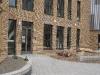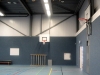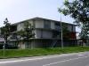 Gevels van de sportzaal als sandwitch element met op gelijmde steenstrippen.